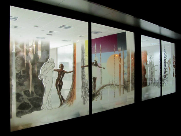 De 19-jarige Dries Peeten kreeg carte blanche voor het ontwerp. Hij liet zich inspireren door de bosrijke omgeving en de reeds aanwezige kleuren. Dries tekende geklede en naakte lichamen in allerlei technieken en liet ze versmelten met de bomen. Het kunstwerk is te groot om in één oogopslag te vatten (106 m²!) en kan daarom gelezen worden als een film: een cinematografische aanpak in een statisch medium.
